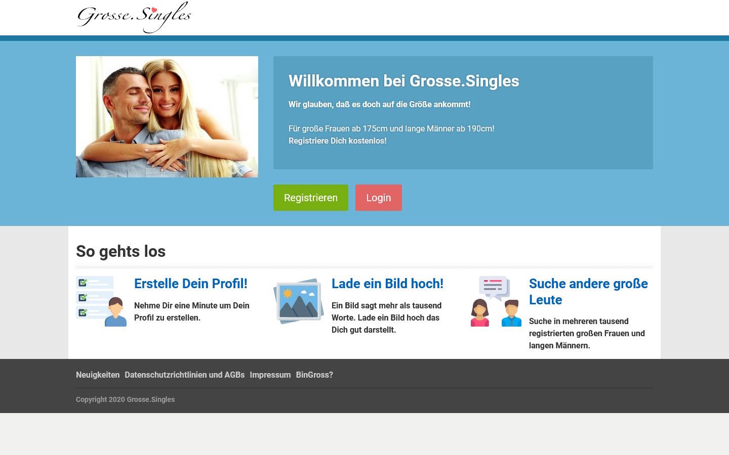 Die Startseite von Grosse.singles macht auf den ersten Blick leider keinen seriösen Eindruck. Die Seite vermittelt den Standpunkt, dass es bei der Partnersuche doch auf die Größe ankommt. Sicherlich ein eher fragwürdiger Ansatz, aber auch hierfür gibt es sicherlich eine Zielgruppe. Allerdings können wir hier kaum etwas über das Portal und seine Funktionen in Erfahrung bringen. Daher haben wir zunächst ein eher weniger gutes Gefühl bei der Seite. Jedoch können wir in den AGB keine Hinweise auf Abzocke entdecken.