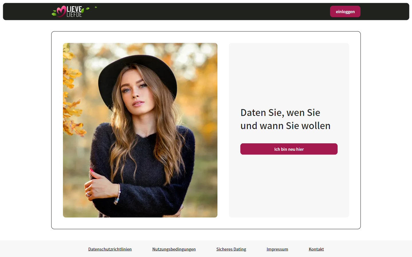 Die Startseite der LieveLiefde.com Datingseite wirkt bereits wenig seriös. Wen und wann wir wollen, sollen wir hier daten können. Wie genau das funktionieren soll, erfahren wir aber nicht. Informationen zu den Funktionen oder der Zielgruppe der Seite gibt es nicht. Wir vermuten, dass wir hier eher unsere große Liebe als kurzfristige Bekanntschaften finden sollen. Eine derartige Intransparenz auf der Startseite ist unserer Erfahrung nach bereits ein erstes Indiz für eine mögliche Abzocke. Wir schauen uns die AGB genauer an, um einen besseren Eindruck zu erhalten.