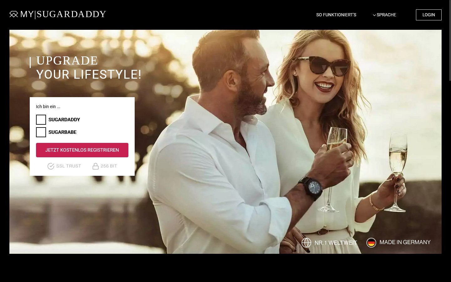 Auf der Startseite von MySugarDaddy.eu sehen wir zuerst das Bild von einem Paar, dass bei Sonnenuntergang mit einem Glas Sekt anstößt. Daneben finden wir den Anmeldebereich und weiter unten sehen wir noch Erfahrungsberichte von Nutzern und kurze beschreibende Texte. Erfahrungsgemäß ist das jedoch noch zu wenig Inhalt, als dass wir denken, es mit einem seriösen Angebot zu tun zu haben. Allerdings finden wir in den AGB keine konkreten Hinweise auf Abzocke.
