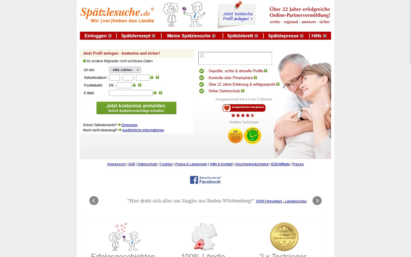 SpaetzleSuche.de gibt auf ihrer Startseite an, dass sie bereits seit 22 Jahren erfolgreiche Online-Partnervermittlung vor allem für den ländlichen Bereich anbieten. Als Betreiber dieses seriösen Angebots können wir hier Jens Romer aus Eningen unter Achalm aus Deutschland ausfindig machen. Seriös deshalb, weil es sich unserer Erfahrung nach hierbei nicht um Abzocke handelt.