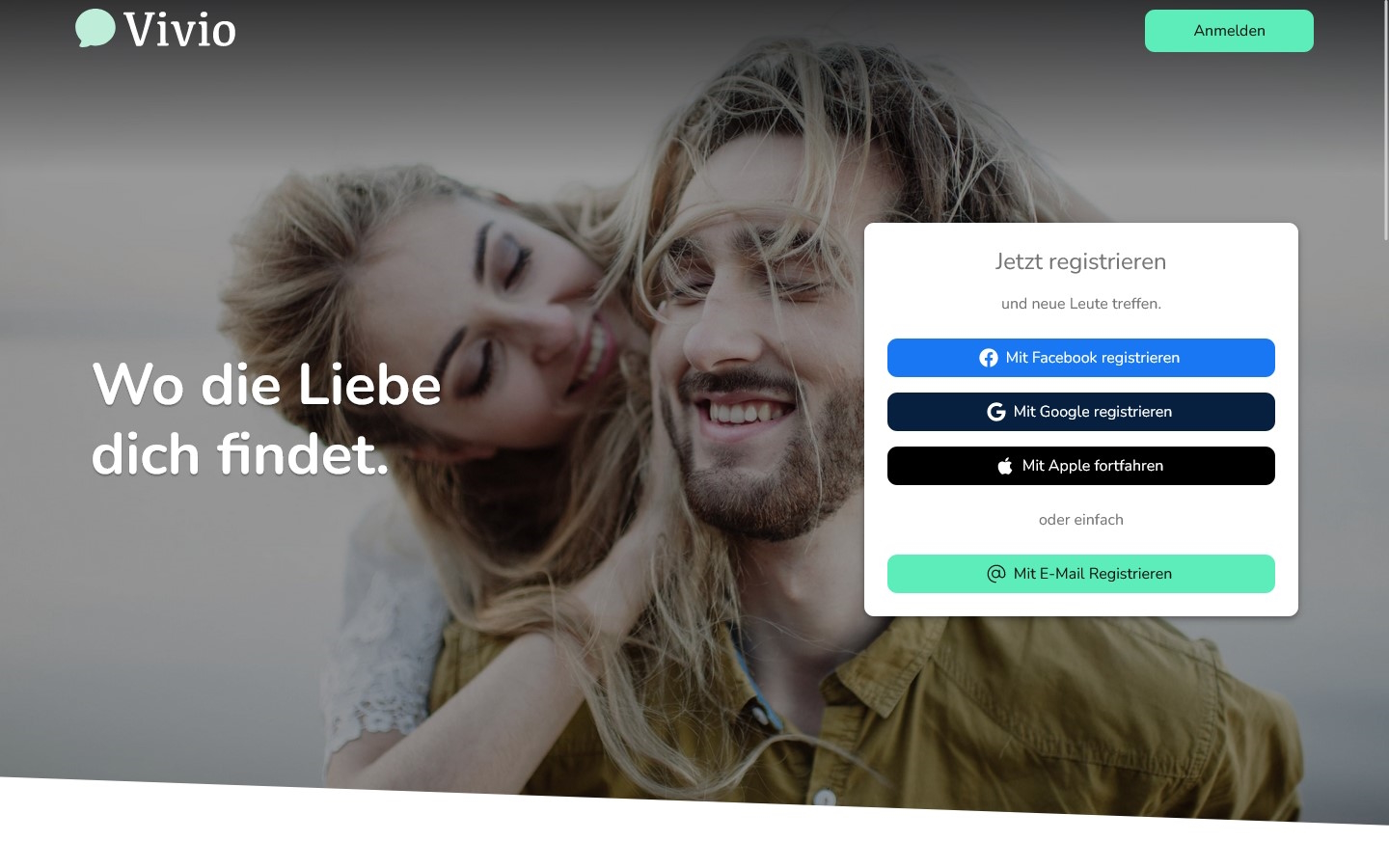 „Wo die Liebe dich findet.“ Dieser Satz begrüßt uns auf der Startseite von Vivio.app. Im Hintergrund sehen wir ein glücklich wirkendes Paar. Ansonsten finden wir auf der Startseite lediglich den Anmeldebereich für neue Nutzer und weiter unten ein paar kurze beschreibende Texte über das Portal. Unserer Erfahrung nach erhalten wir hier allerdings zu wenig Informationen, als dass wir von einer seriösen Startseite reden können. Da wir bereits die Abzocke wittern, werfen wir einen prüfenden Blick in die AGB und suchen nach ausgewählten Stichworten. Und tatsächlich werden wir hier auch fündig.